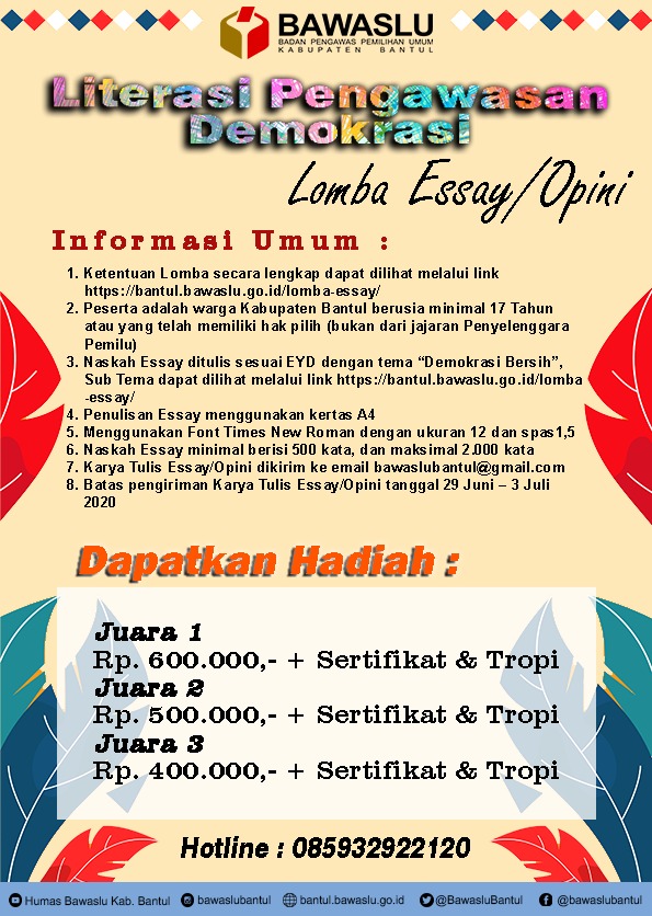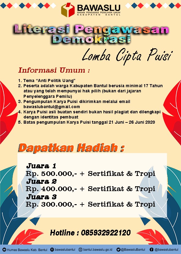 Bawaslu Bantul Adakan Lomba Cipta Puisi dan Essay/Opini humas | Rabu, Mei 20, 2020 - 14:57 Tag Berita Utama Pengumuman Share Berita Terkini humas Senin, Desember 15, 2025 - 09:07 Bersiap Menuju WBK dan WBBM, Bawaslu Bantul Lakukan Studi Tiru Zona Integritas ke Kemenag Bantul humas Rabu, Desember 10, 2025 - 17:04 Pastikan Data Pemilih Akurat, Bawaslu Bantul Awasi Pleno PDPB TW IV Tahun 2025 humas Rabu, Desember 10, 2025 - 16:58 Perkuat Pengelolaan Arsip, Bawaslu Bantul Gandeng Dispusip Bantul Adakan Sosialisasi Kearsipan Lihat Lainnya