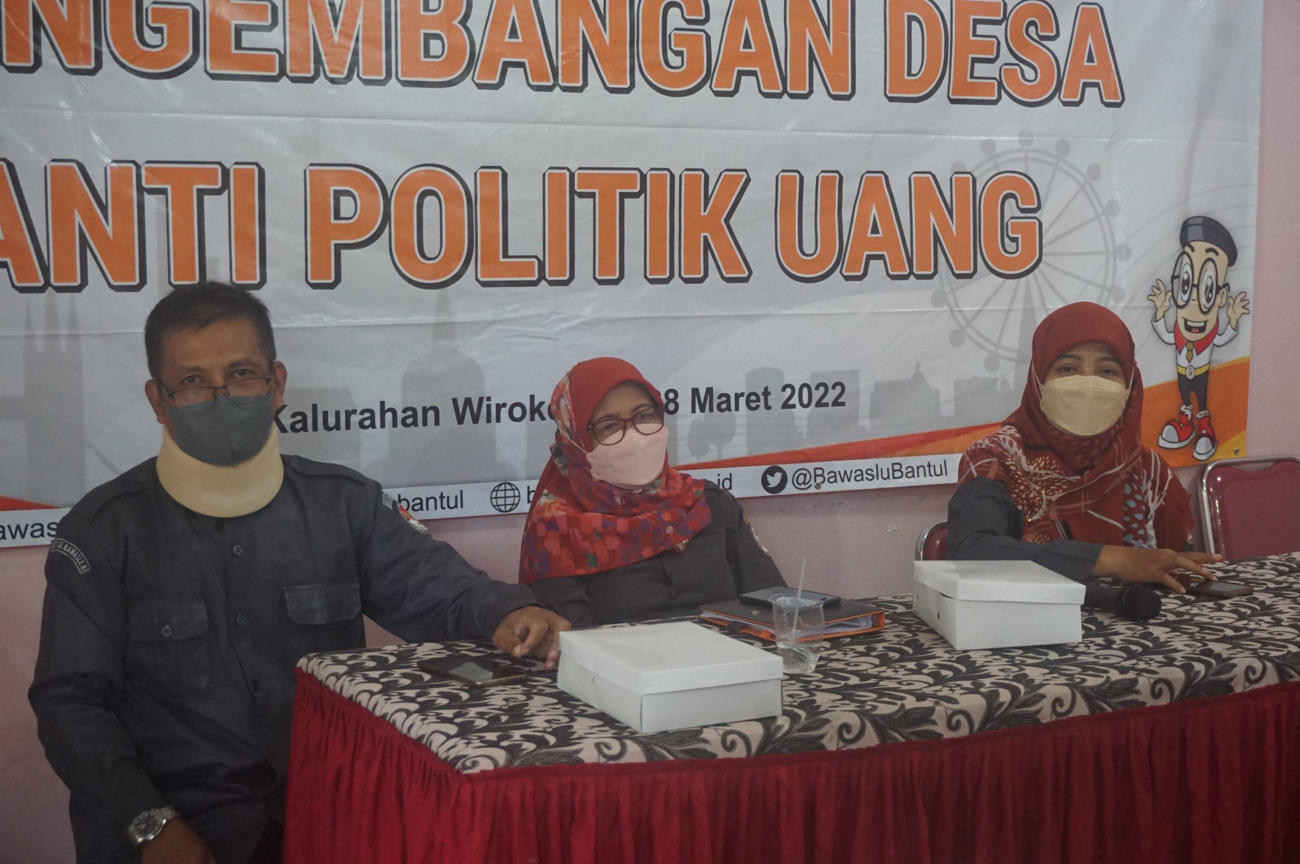 Senin, 28 Maret 2022 Bawaslu Kabupaten Bantul kembali melakukan Sosialisasi Pengembangan Desa Anti Politik Uang (APU) di Kalurahan Wirokerten Kecamatan Banguntapan. Apa yang menjadi tugas Bawaslu Kabupaten Bantul saat ini salah satunya dalam rangka upaya pencegahan tentang politik uang. Kegiatan tersebut dihadiri oleh Ketua Bawaslu Kabupaten Bantul Harlina, S.H, Anggota Bawaslu Kabupaten Bantul Drs. Supardi, Dhenok Panuntun Tri Suci Asmawati, S.H., M.H. dan Lurah Wirokerten dengan mungundang beberapa tamu undangan dari unsur stakeholder dan relawan.