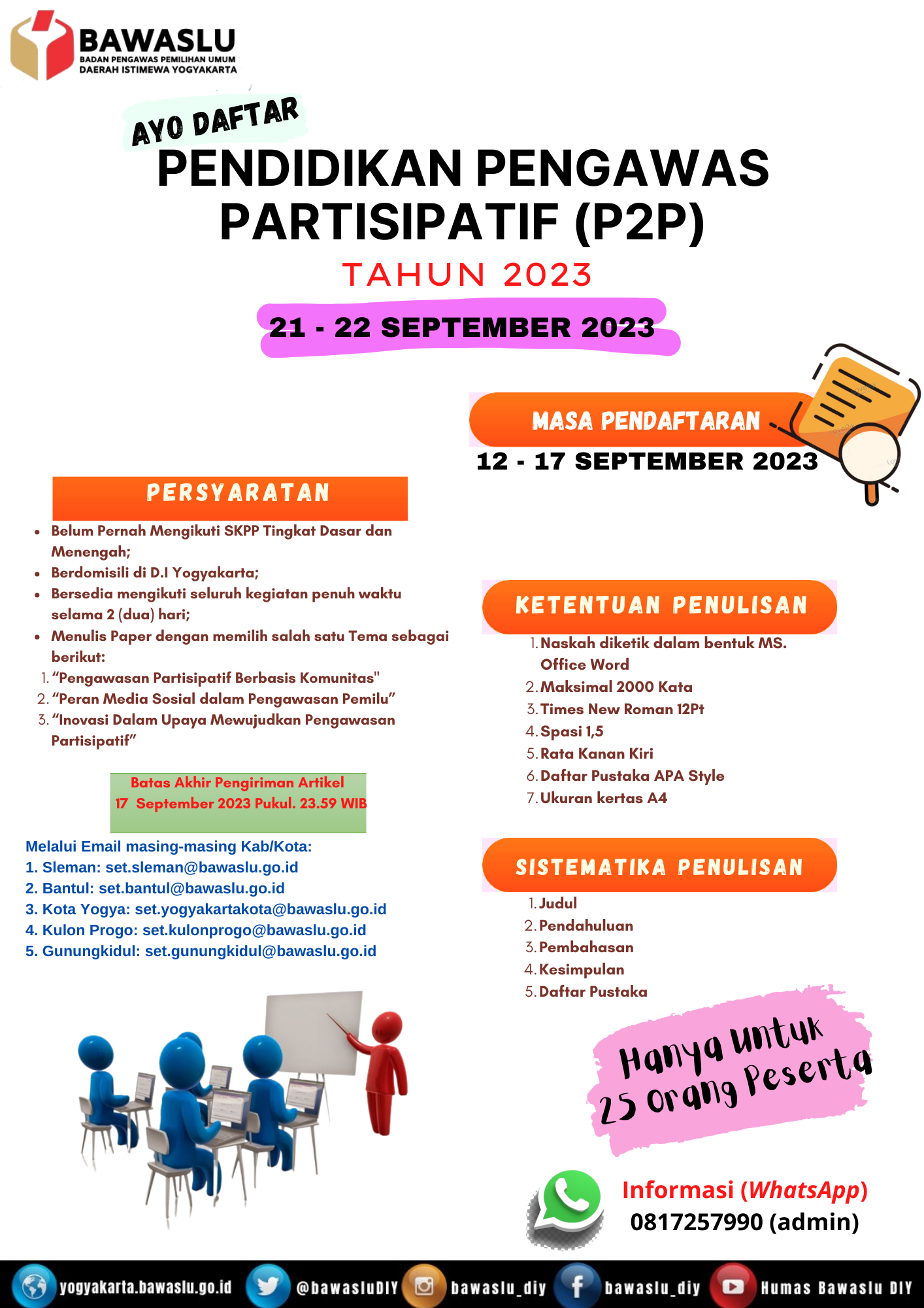 Pendaftaran Pendidikan Pengawas Partisipatif (P2P) Tahun 2023 humas | Kamis, September 14, 2023 - 13:52 Tag Berita Berita Utama Share Berita Terkini humas Senin, Desember 15, 2025 - 09:07 Bersiap Menuju WBK dan WBBM, Bawaslu Bantul Lakukan Studi Tiru Zona Integritas ke Kemenag Bantul humas Rabu, Desember 10, 2025 - 17:04 Pastikan Data Pemilih Akurat, Bawaslu Bantul Awasi Pleno PDPB TW IV Tahun 2025 humas Rabu, Desember 10, 2025 - 16:58 Perkuat Pengelolaan Arsip, Bawaslu Bantul Gandeng Dispusip Bantul Adakan Sosialisasi Kearsipan Lihat Lainnya