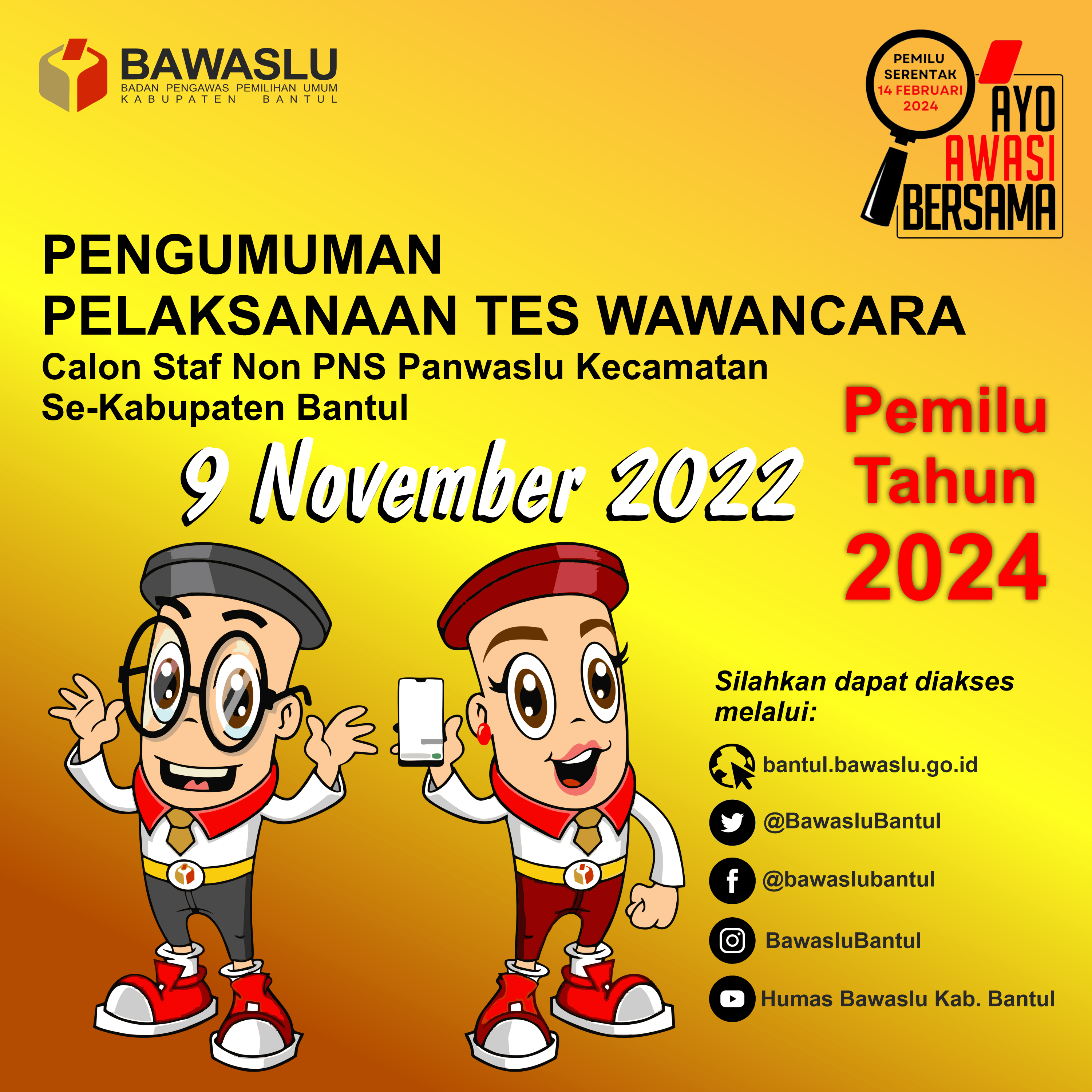 Pengumuman Pelaksanaan Tes Wawancara Calon Staf Non PNS Panwaslu Kecamatan Se-Kabupaten Bantul humas | Selasa, November 8, 2022 - 20:51 Tag Berita Berita Utama Publikasi Share Berita Terkini humas Senin, Desember 15, 2025 - 09:07 Bersiap Menuju WBK dan WBBM, Bawaslu Bantul Lakukan Studi Tiru Zona Integritas ke Kemenag Bantul humas Rabu, Desember 10, 2025 - 17:04 Pastikan Data Pemilih Akurat, Bawaslu Bantul Awasi Pleno PDPB TW IV Tahun 2025 humas Rabu, Desember 10, 2025 - 16:58 Perkuat Pengelolaan Arsip, Bawaslu Bantul Gandeng Dispusip Bantul Adakan Sosialisasi Kearsipan Lihat Lainnya