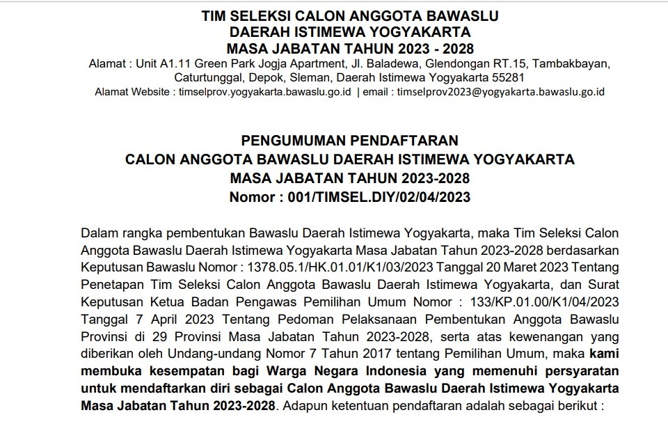 Pengumuman Pendaftaran Calon Anggota Bawaslu Daerah Istimewa Yogyakarta Masa Jabatan Tahun 2023-2028 humas | Kamis, April 13, 2023 - 09:30 Files Download Tag Berita Berita Utama Pengumuman Uncategorized Share Berita Terkini humas Senin, Desember 15, 2025 - 09:07 Bersiap Menuju WBK dan WBBM, Bawaslu Bantul Lakukan Studi Tiru Zona Integritas ke Kemenag Bantul humas Rabu, Desember 10, 2025 - 17:04 Pastikan Data Pemilih Akurat, Bawaslu Bantul Awasi Pleno PDPB TW IV Tahun 2025 humas Rabu, Desember 10, 2025 - 16:58 Perkuat Pengelolaan Arsip, Bawaslu Bantul Gandeng Dispusip Bantul Adakan Sosialisasi Kearsipan Lihat Lainnya